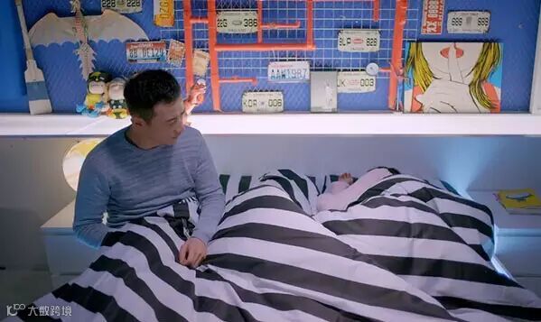 二楼的主卧室,黑白条形的床品增添现代感,蓝色的床头背景墙上,装饰着橘色的小管道和网格线,来延续整体风格,个性的摆件让空间更新别致。看看男二号的深情小眼神,你确定这是在戏里么?