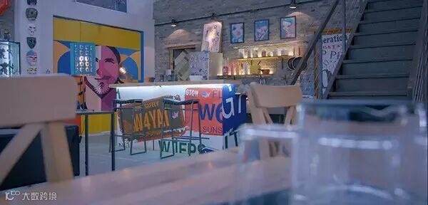 客厅是最为酷炫的地方,各种各样的个性画面摆饰充斥其中,让人感觉十分特别,同时从切格瓦拉的头像画和蓝色做旧铁盒上,我们依然能感受到工业风的气氛。最新奇的是右侧的大幅3D场景画,十分逼真。
