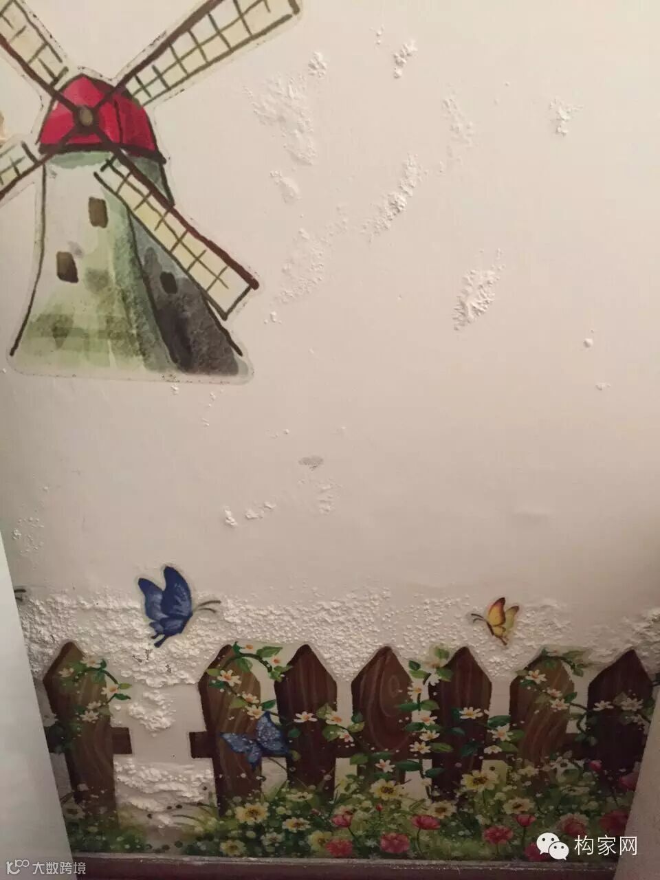卫生间外墙、卧室墙体油漆起皮。后来实在看不下去了,现在就自己买壁纸贴起来凑合着,眼不见为净。但有些地方还是遮不住,现在每天回家,看到都心烦!