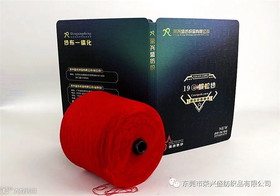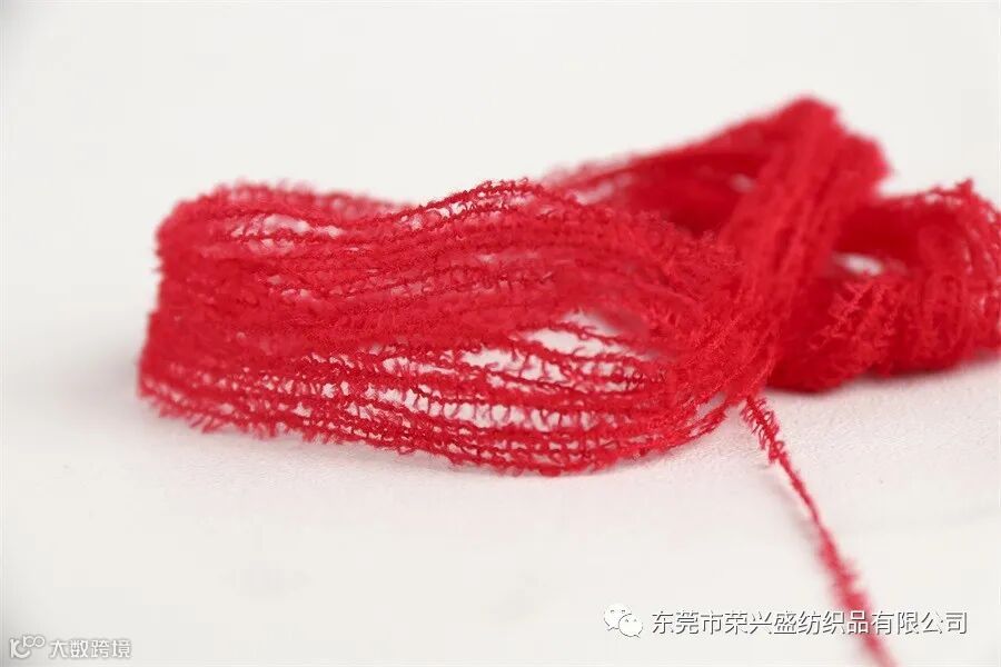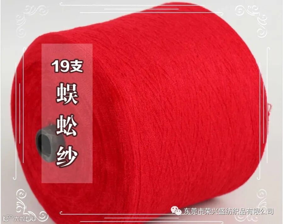蜈蚣纱属于羽毛纱的一种,它比较细,通常在10S左右,同时也是花式纱线的一种。其结构由芯线和饰线组成,羽毛按一定方向排列。其工艺主要由针织和割绒组成,即一针一刀。形成单针织成的芯线和中段被芯线握持,两头被割刀切断形成一定长度的毛羽饰纱,羽长自然竖立,光泽好,手感柔软。
