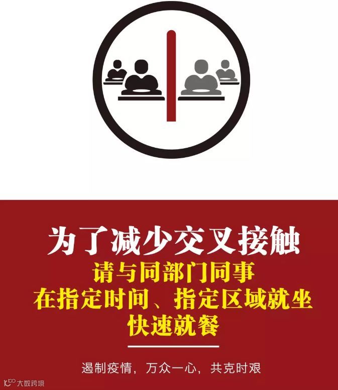 “最少接触、最小交叉”,就餐时须严格按照 “规定时间、规定地点、规定区域”的“三定”原则执行。