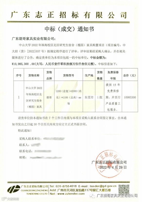 热烈祝贺公司成功中标“中山大学2022年珠海校区北区研究生宿舍(槿园)家具购置项目”此次投标项目公司领导十分重视,对招标文件、技术质量等都明确了具体要求,经过公司部门相关人员的努力,高效保质的完成了投标工作,最终我司凭借雄厚的实力、良好的信誉及丰富的项目经验赢得了中山大学领导的肯定。