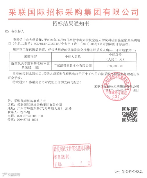 2021年6月24日,我公司在“中山大学航空航天学院科研实验室家具采购项目”的竞标中,凭借过硬的产品质量、扎实高效的工作作风、卓越的运作团队与良好的企业信誉,以绝对的优势顺利中标。