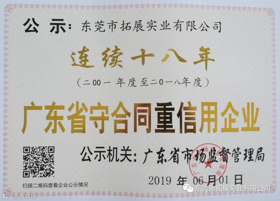 近日,东莞市拓展实业有限公司再次荣获“广东省守合同重信用企业”。这是拓展实业连续18年获此殊荣。在这背后,是我们一直以来坚守诚信、守法的信用原则,依法依规、扎扎实实地去经营企业。是社会对拓展实业有限公司的认可证明。