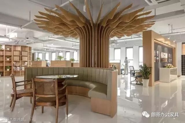 尤为出彩的是,沙发与木椅周身的祥云纹承载着含蓄祥和的意象,办公桌左右的图样则化用太阳的造型,与企业的核心文化也构成巧妙的呼应。最终打造了一个深蕴人文气息与现代风尚的绿色办公空间。