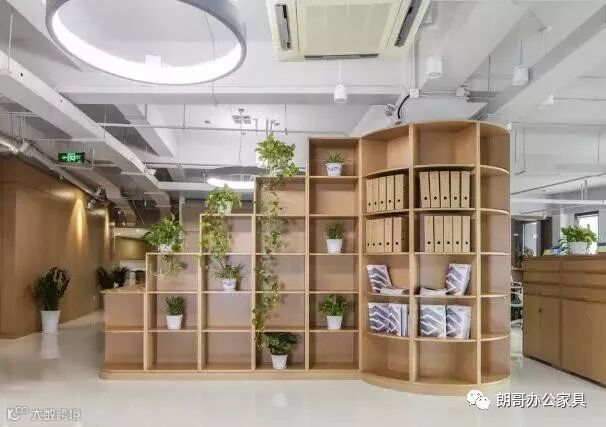 “自然”由抽象的概念转化为具体可见的设计元素,原木则是空间主角。开阔的工作区以木饰面包覆墙壁,烘托出舒适惬意的氛围。错落有致的方格柜中摆放着绿色植物,带来清新舒适的工作体验,同时为略显空旷的空间进行区域的划分。