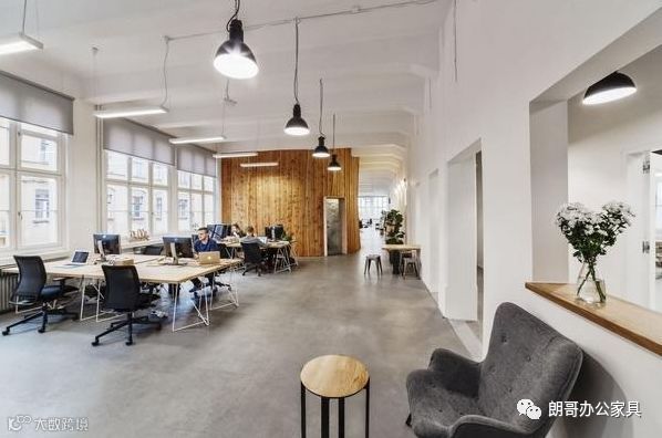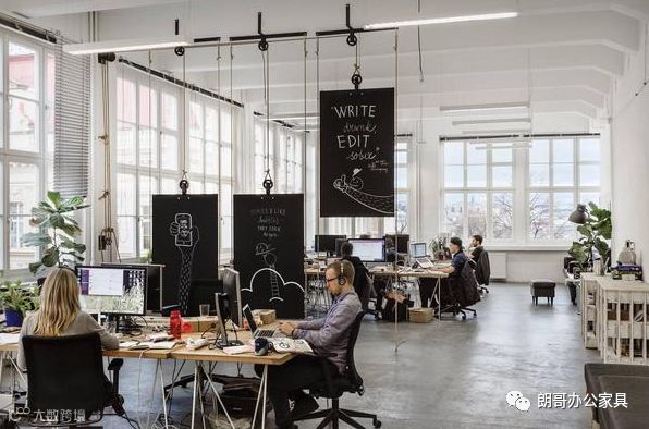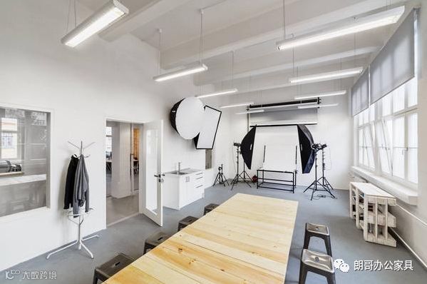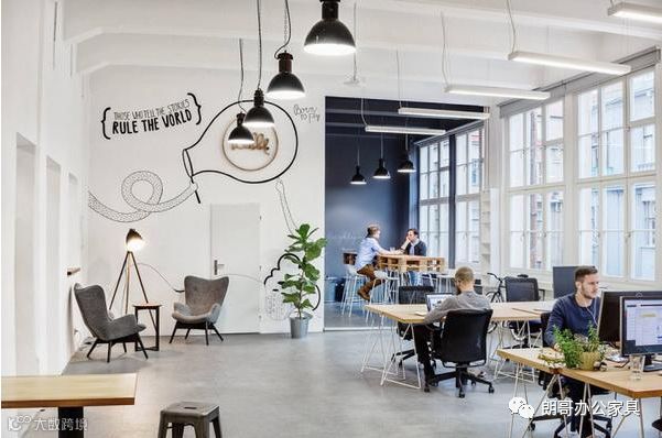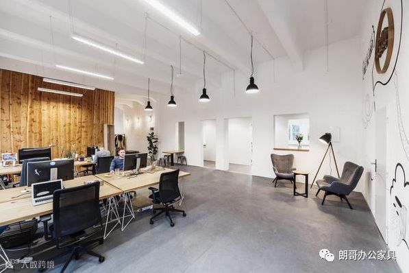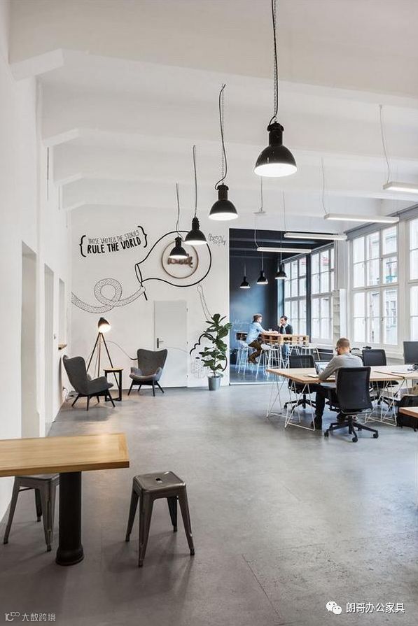 这充满艺术风格的吊顶灯衬托出了这家创新型数字广告公司的简约办公空间,拥有充足的光线,能使办公效率提高。