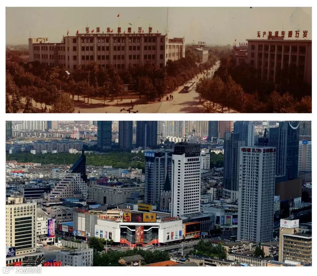 十、淮河路之变 上图:1995年拍摄的淮河路;下图:俯瞰淮河路。作者:闫炜(上)、唐大云(下)