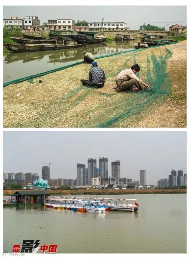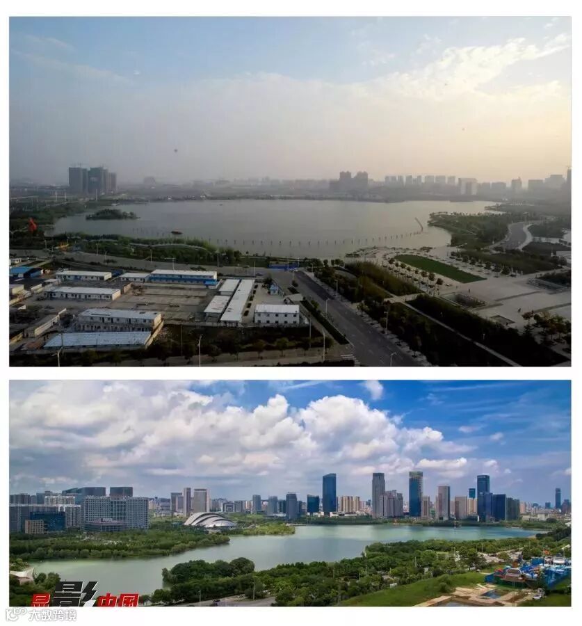 十三、天鹅湖之变 上图:2010年4月合肥天鹅湖边,很多建筑还没有建起来 ;下图:2017年7月的天鹅湖风貌。作者:王从启(上)、王韶斌(下)