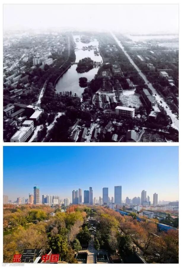 七、包公园之变 上图:1978航拍合肥市芜湖路包河公园;下图:2017年12月18日,合肥包公园,美丽的秋色。作者:黄欣(上)、李福凯(下)