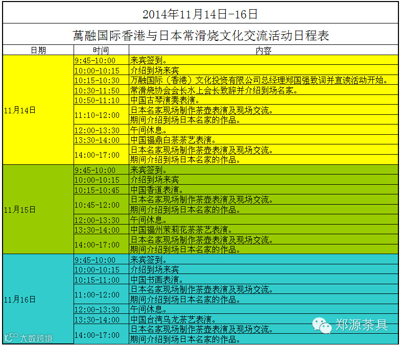上图为:萬融国际香港与日本常滑烧文化交流日暨“海上仙都”艺术白茶品鉴会·天津活动日程表