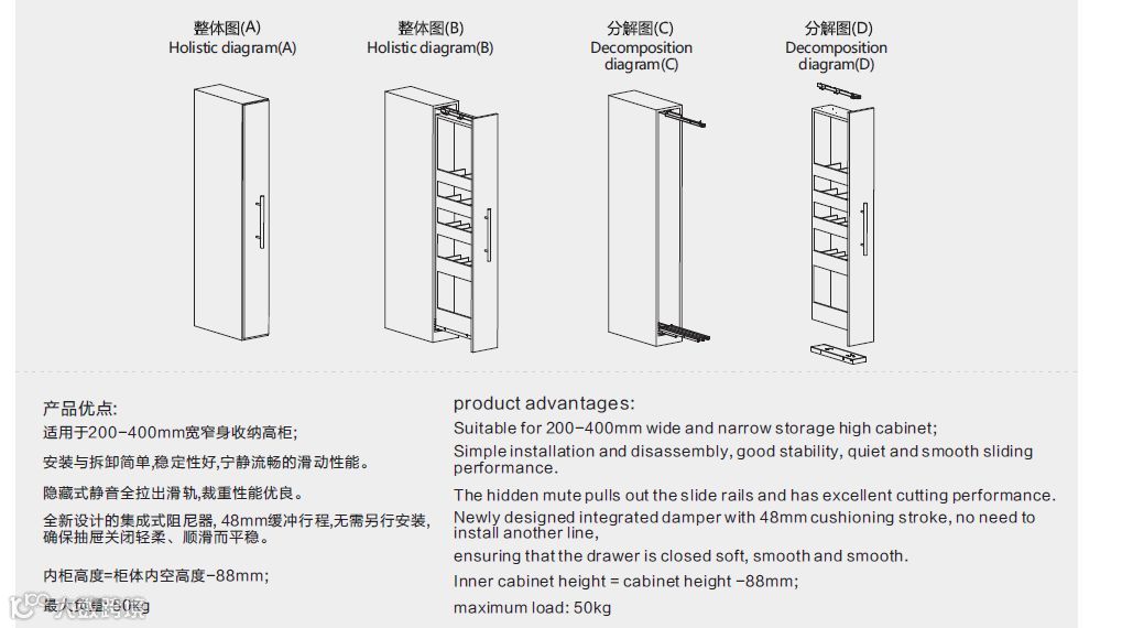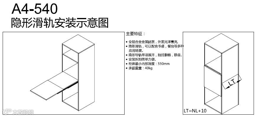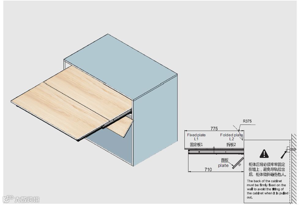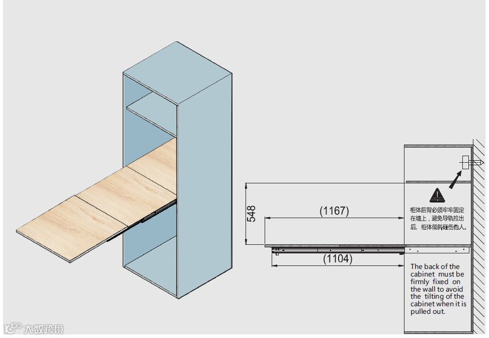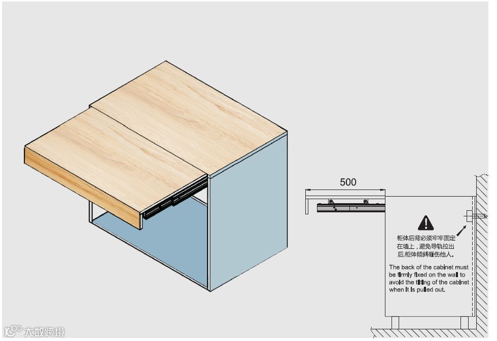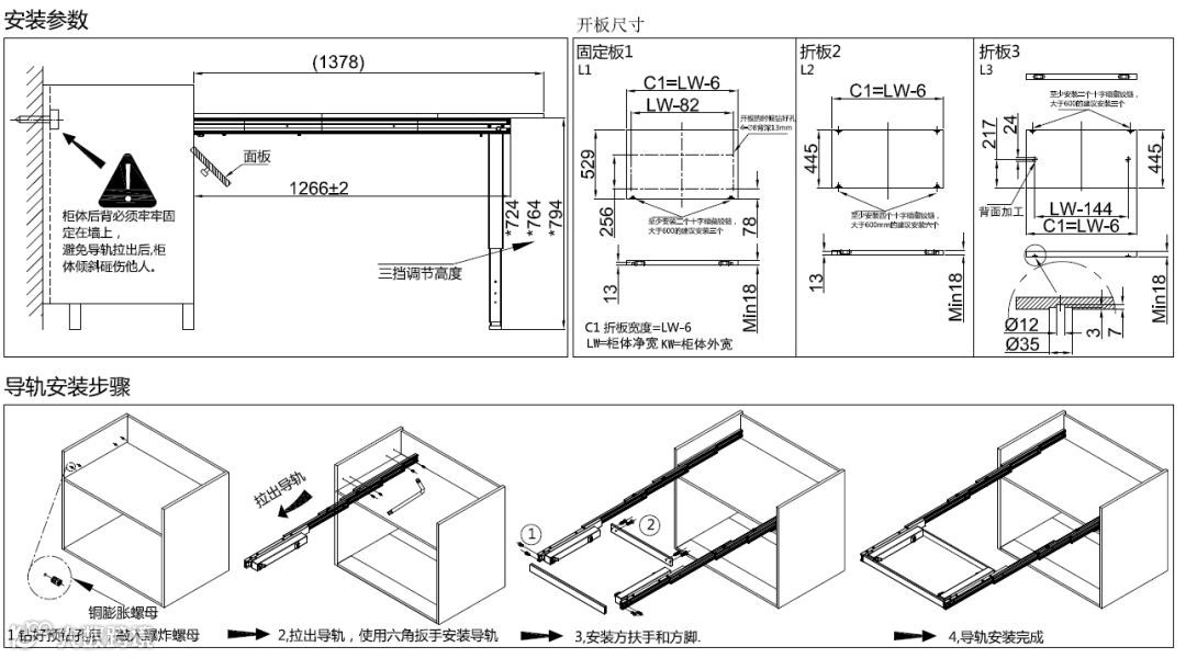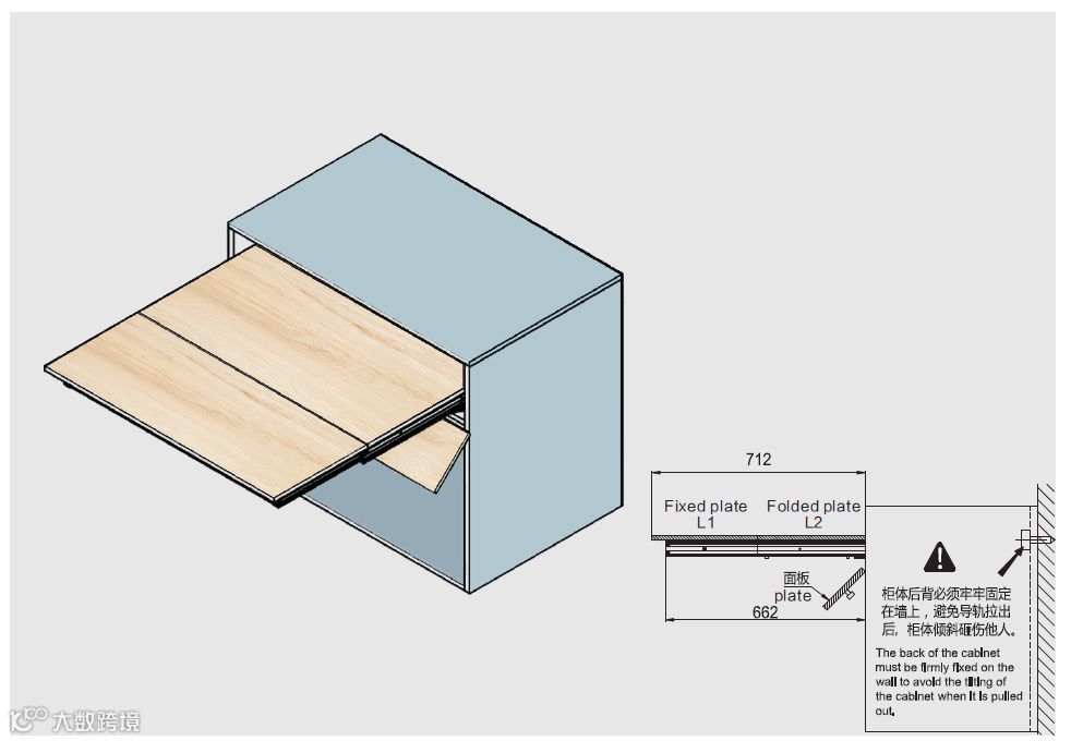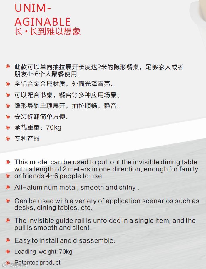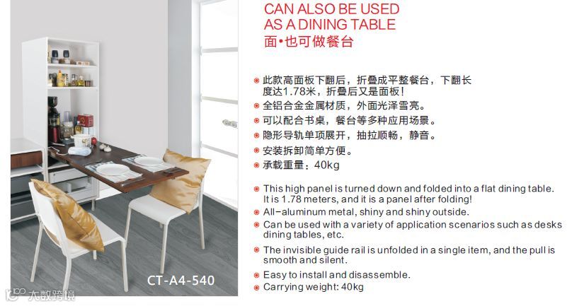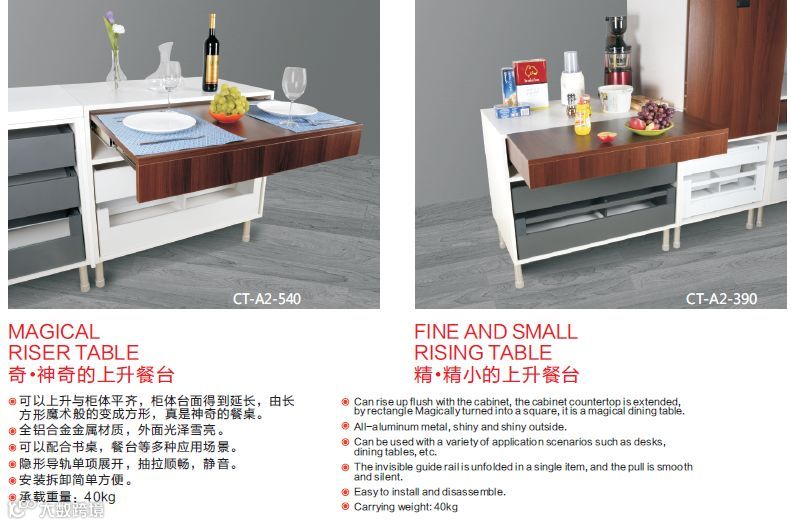 全拉式抽屉具有最佳的存储空间和人性化使用方式,其创新设计的阻尼系统和静音滑轨的完美结合,使得抽屉只需轻碰就可轻柔、顺滑且平稳的关闭,给厨房给多的遐想、更多的空间。隐藏折叠抽拉餐台导轨系列具有最佳的使用空间,更符合人性化的使用方式,其创新设计给家居更多的体验。