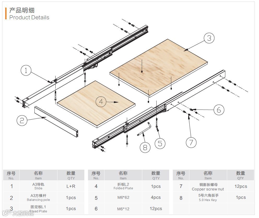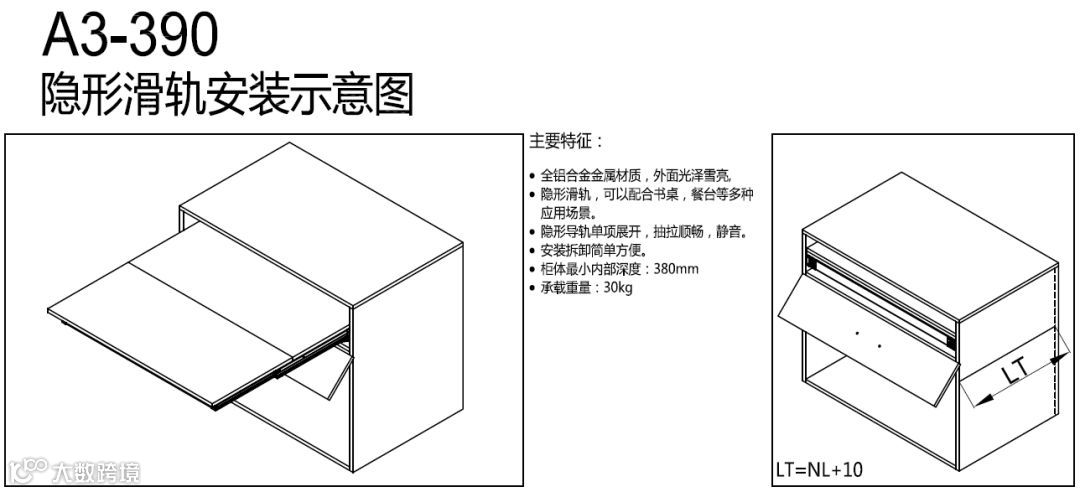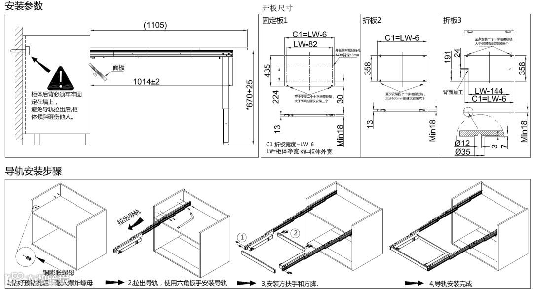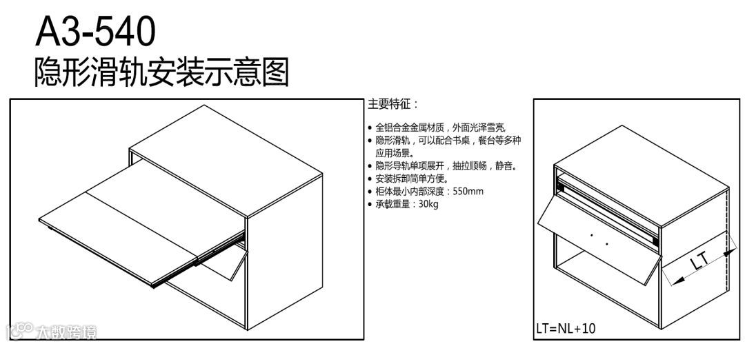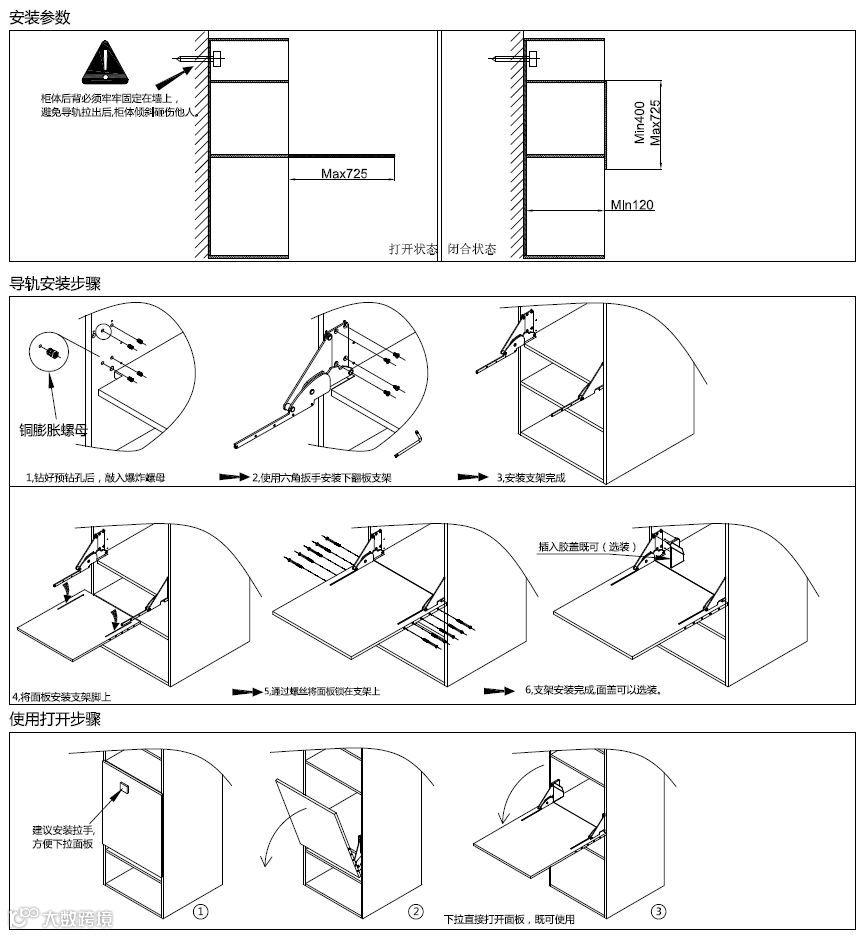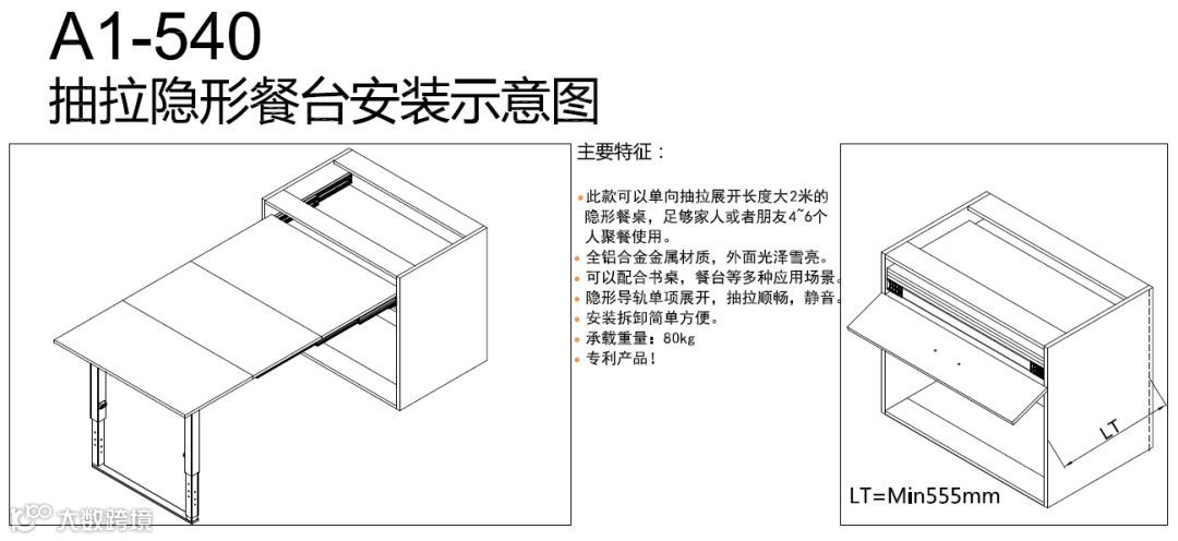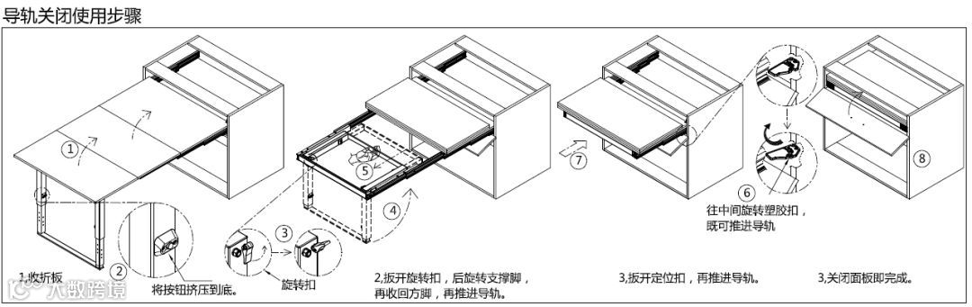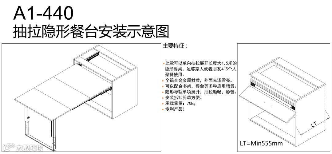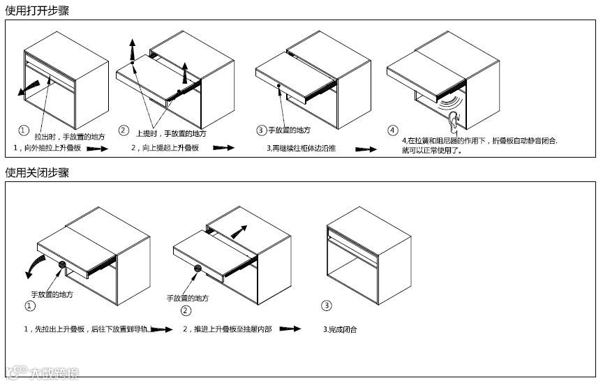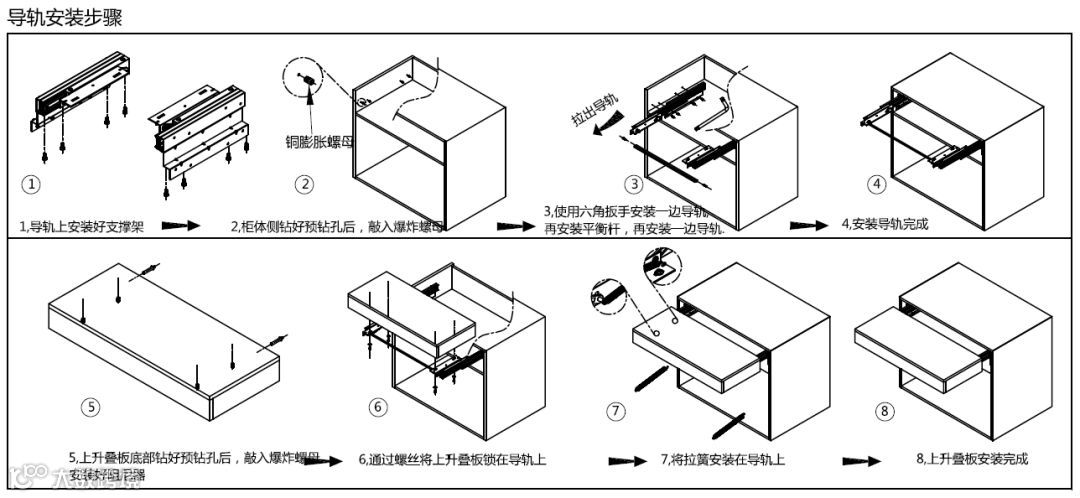 全拉式抽屉具有最佳的存储空间和人性化使用方式,其创新设计的阻尼系统和静音滑轨的完美结合,使得抽屉只需轻碰就可轻柔、顺滑且平稳的关闭,给厨房给多的遐想、更多的空间。隐藏折叠抽拉餐台导轨系列具有最佳的使用空间,更符合人性化的使用方式,其创新设计给家居更多的体验。