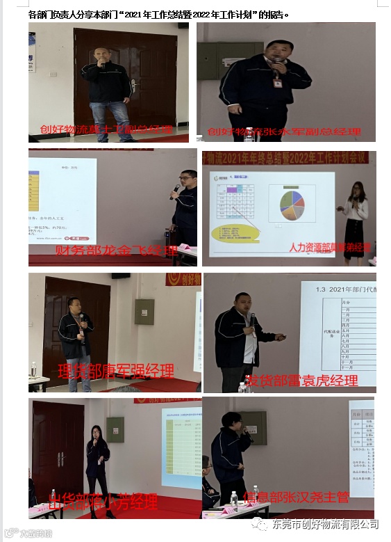 会议上,创好物流总经理梁文扬先生对创好物流2021年度工作进行了总结,对相应问题提出整改措施,并就2022年重点工作进行了部署。各部门负责人分别上台分享所在部门2021年的工作总结与2022年的工作计划及目标。