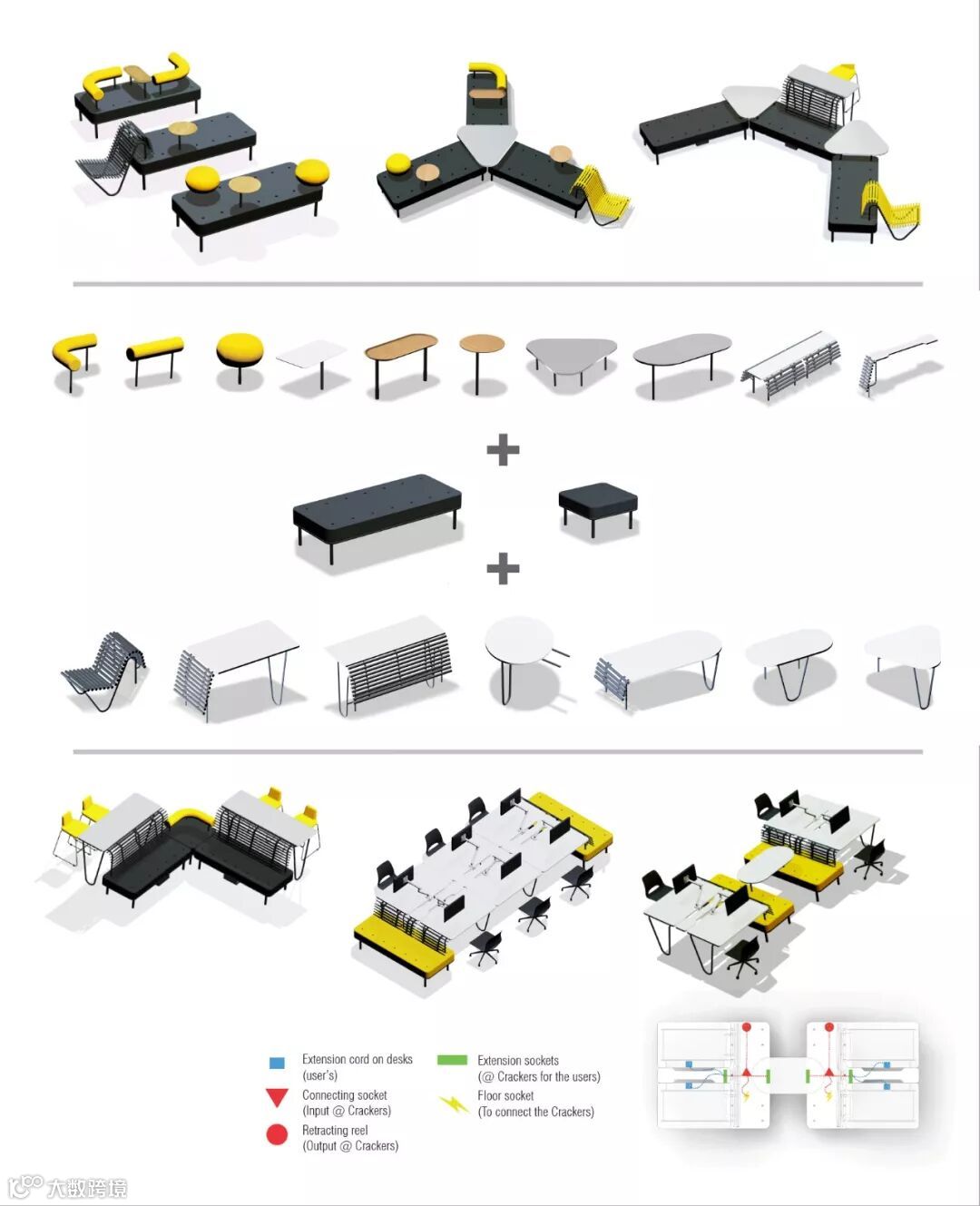 传统办公系统多以屏风作为骨架,而「点子坐乐」则以活跃风格的沙发作为办公系统的灵魂架构,可选购配搭各种功能配件,高低桌面、靠背、扶手、屏风、文具架等等,来适应现场的空间大小,以及各种功能场景,例如公共休闲空间、等候区、洽谈区、小型宣讲、头脑风暴、相邻小组讨论,乃至多人相连工作站等等。