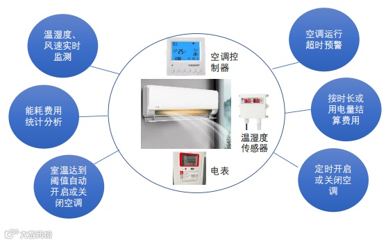 平台对园区空调进行统一管理,联调空调控制器、温湿度传感器、电表,实现实时监测空调运行状况、定时开关空调、节能自控、超时预警、费用结算、能耗费用统计分析等。