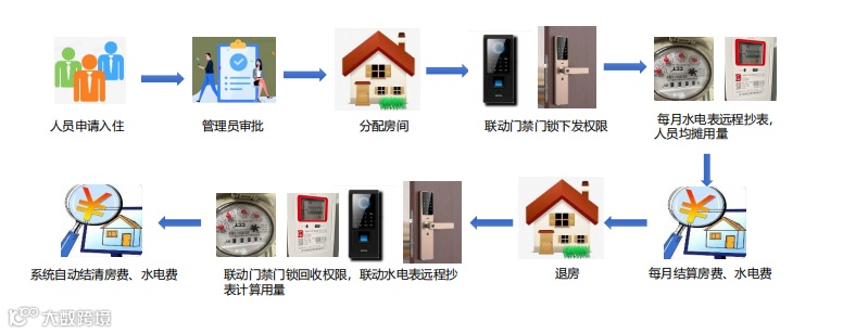 平台通过对宿舍房间及其水电表、门禁、门锁等进行串联管理,实现对园区人员入住、调宿、退宿管理,并联动下发或回收门禁门锁权限,以及联动水电表的用量均摊到入住人员,于每月结算住宿的房费、水电费、租金,实现结算单一键生成,促进了管理效率。
