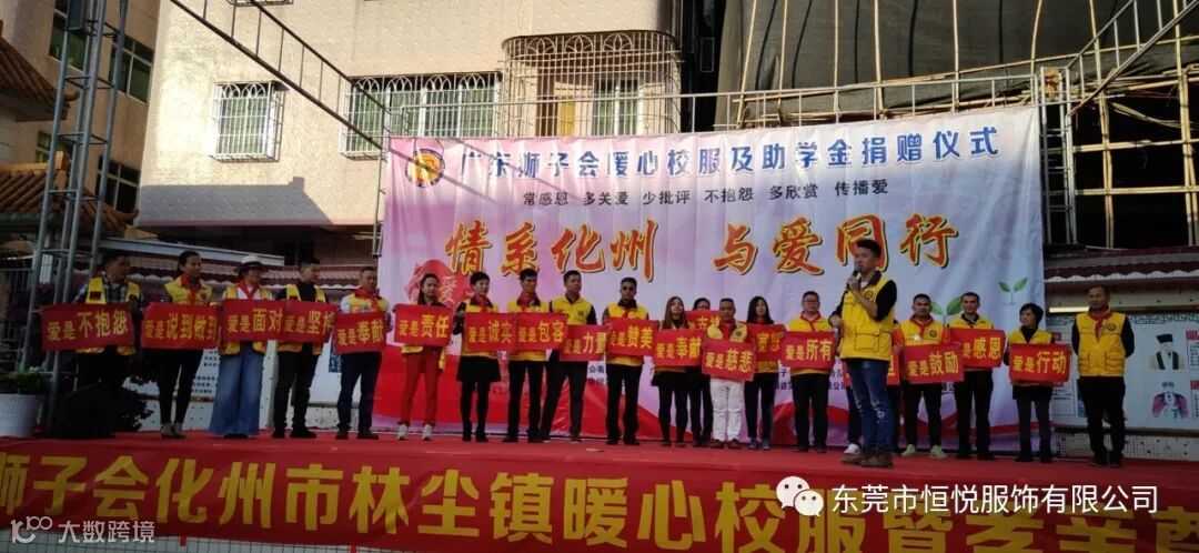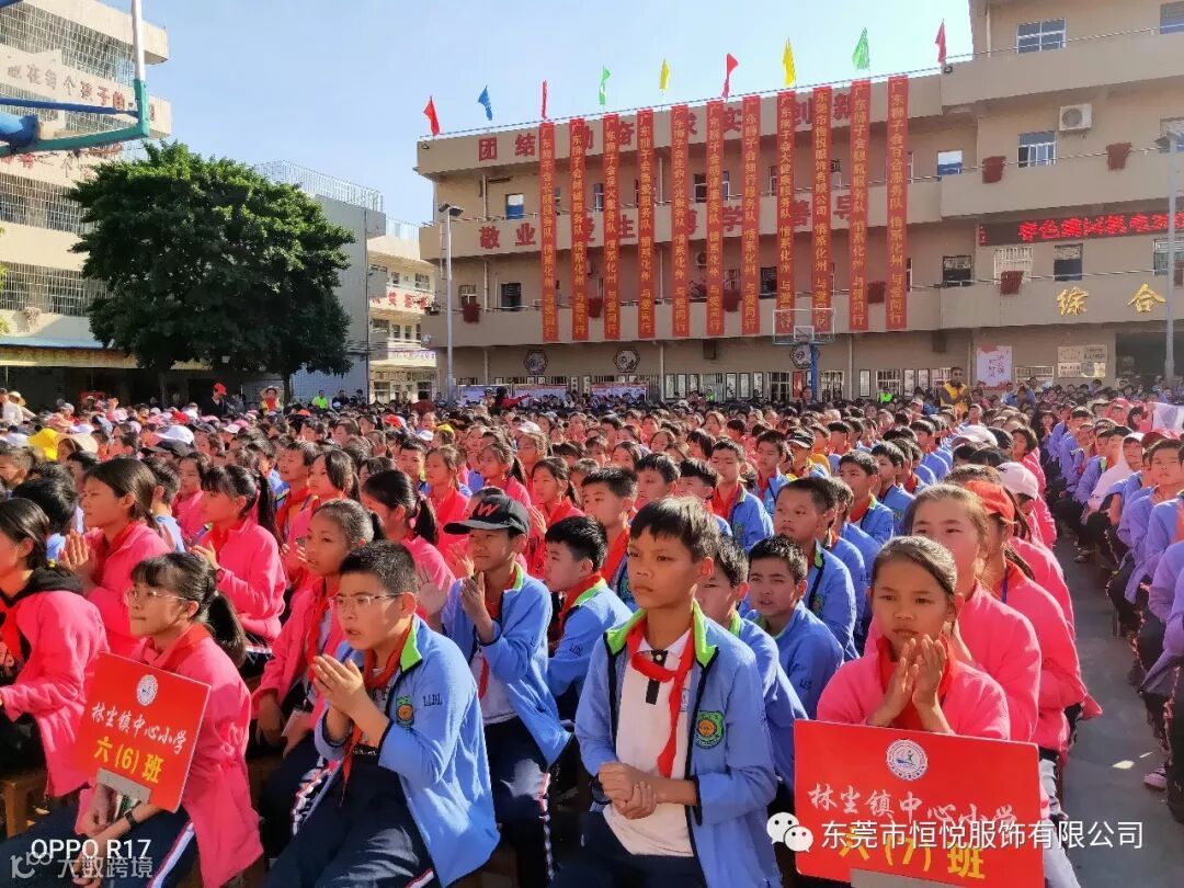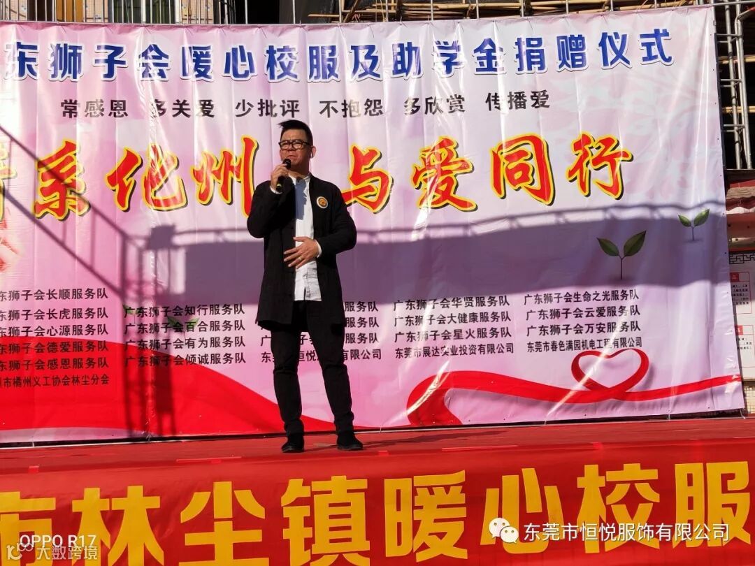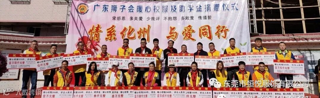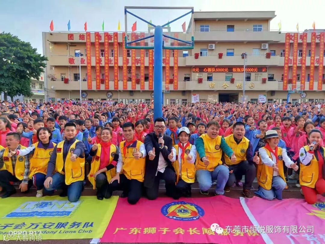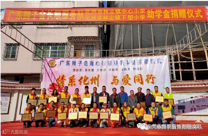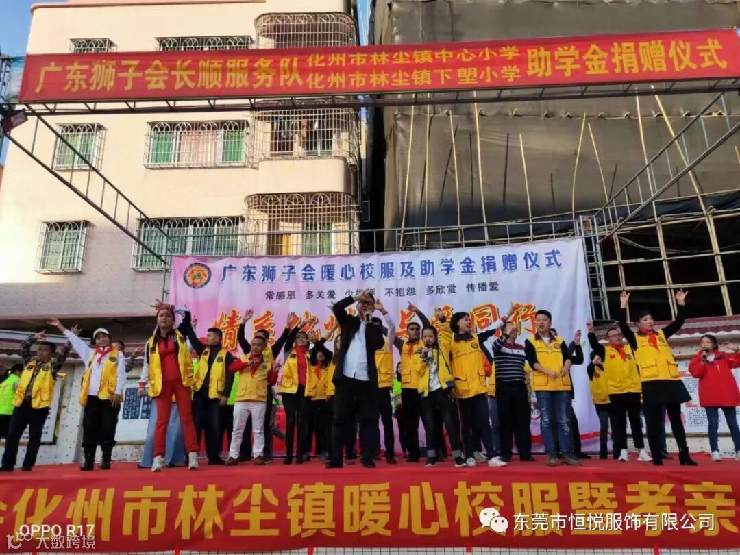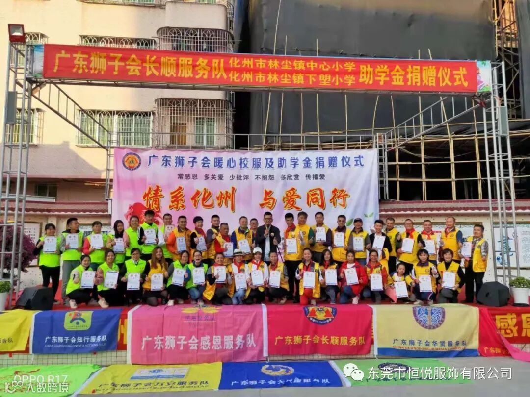 2019年12月4日,由东莞市恒悦服饰有限公司联合广东狮子会长顺服务队,长虎、知行、明泽、银瓶、心源、大健康、倾诚、万安、德爱、生命之光、百合、云爱、铁夫、华贤、有为、感恩、星火等服务队共同协办,东莞市展达实业投资有限公司,东莞市春色满园机电工程有限公司,化州市橘州义工协会林尘分会等共同支持的暖心校服及助学金捐赠活动在化州市林尘镇中心小学顺利举行,林尘镇中心小学及下塱小学共3100多名学生参加了捐赠仪式。化州市教育局党组副书记杨伟,林尘镇党委副书记曾聪,林尘镇中心学校校长王怀全等当地领导也出席了本次活动。