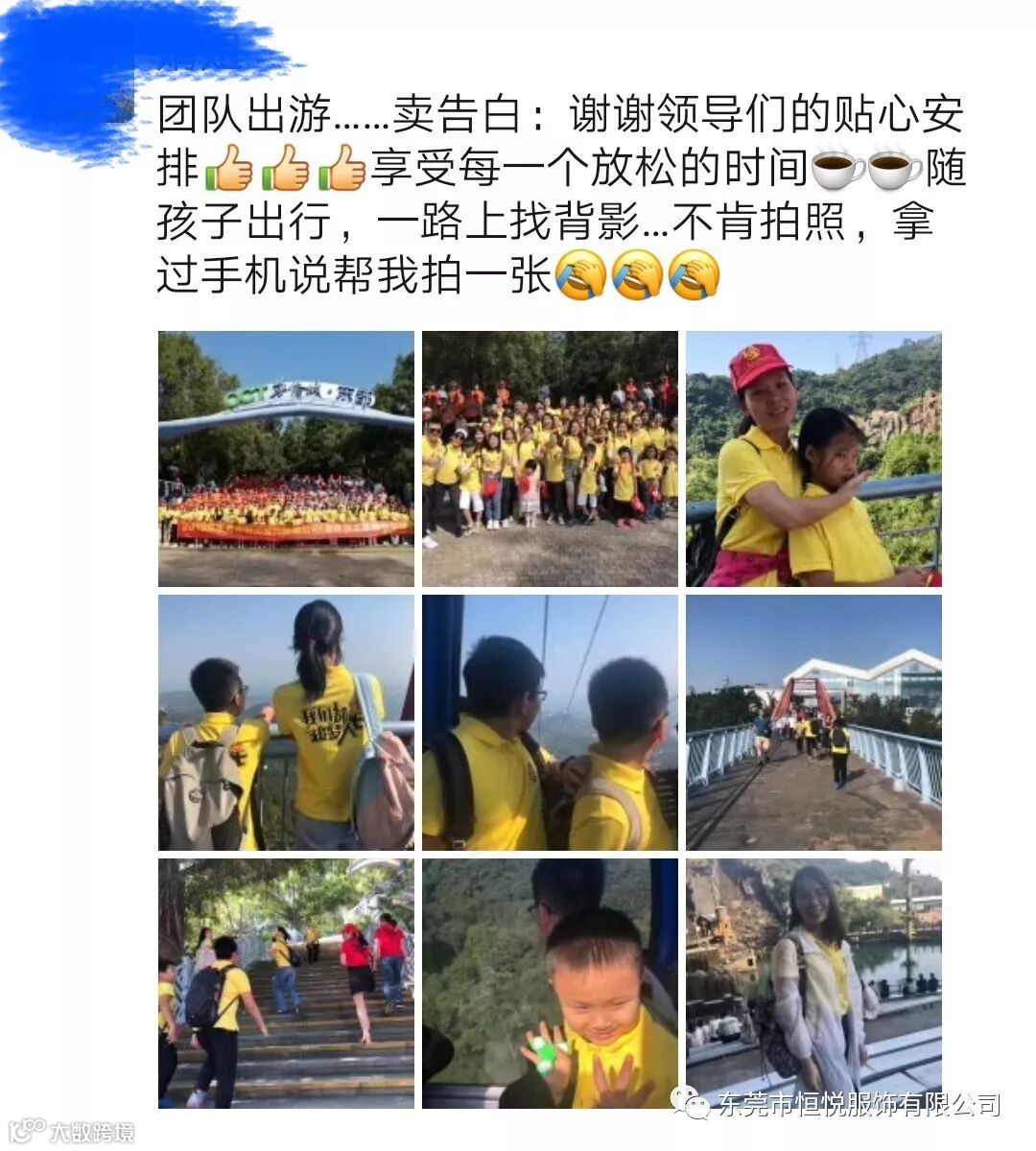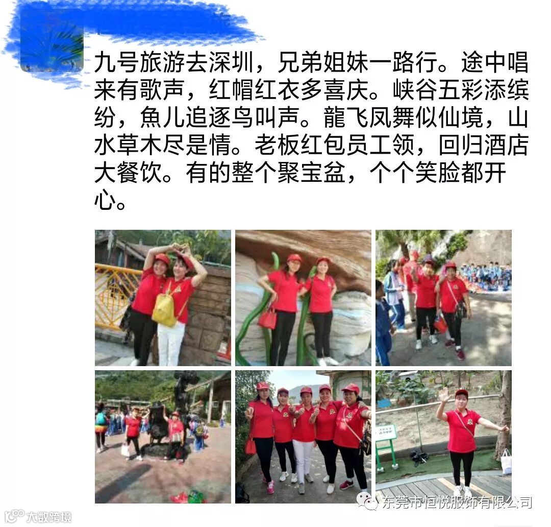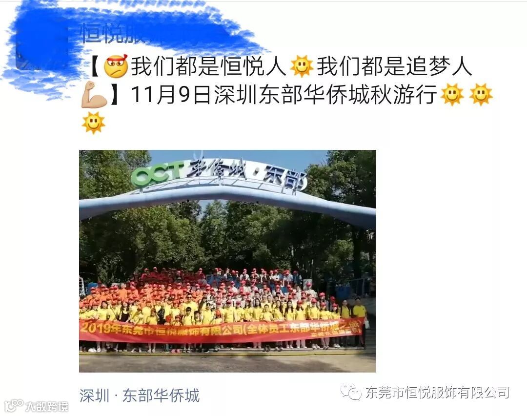 孟冬寒未至,骄阳暖人心。2019年11月9日,立冬后第一天,东莞市恒悦服饰有限公司一年一度的集体旅游来到了深圳东部华侨城。