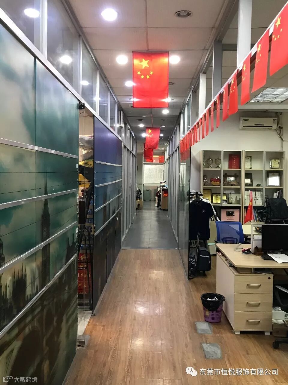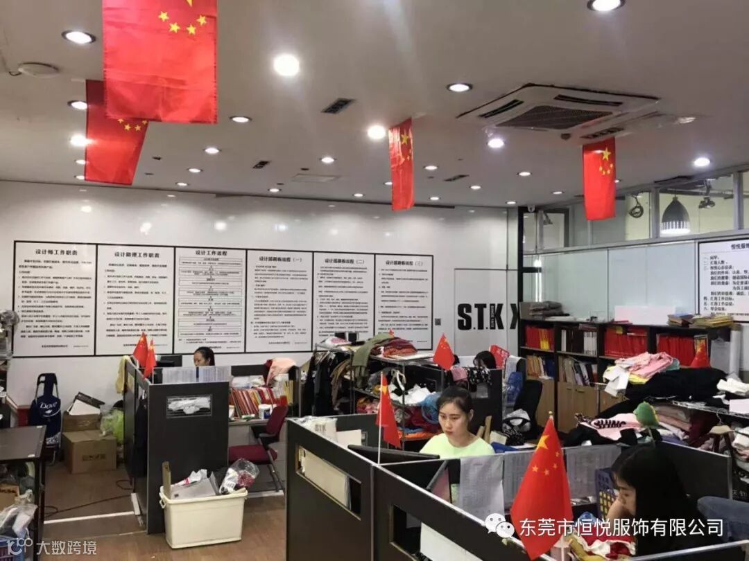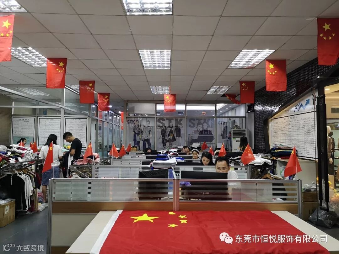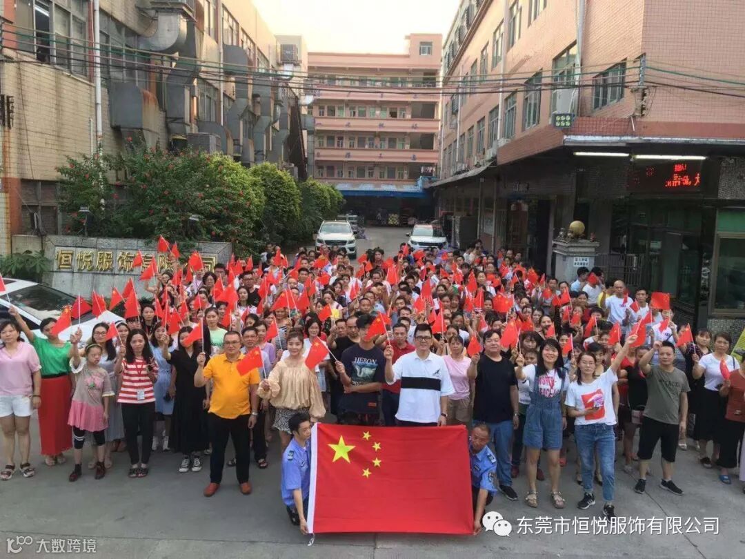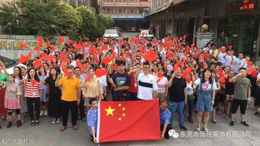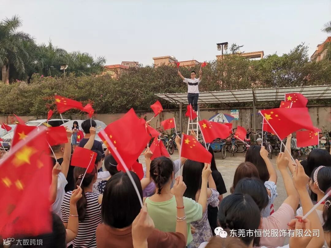 东莞市恒悦服饰有限公司董事长岑定基先生带领公司员工在公司挂上国旗,
