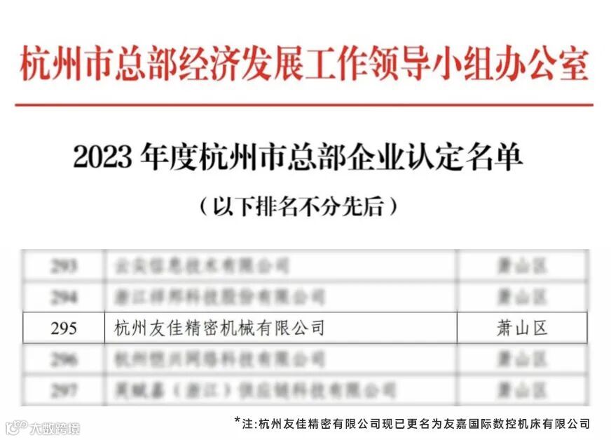 为进一步扶持、培育和引进总部企业,积极打造全国一流总部经济中心,杭州市根据相关文件要求,组织开展了2023年度杭州市总部企业认定工作,最终形成并公示了《2023年度杭州市总部企业认定名单》,友嘉国际数控机床有限公司位列其中。