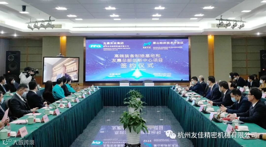 12月12日上午,杭州友佳精密机械有限公司高端装备制造基地和友嘉总部创新中心项目签约仪式在萧山经济技术开发区举行。浙江省委台湾工作办公室主任庄跃成,杭州市委台湾工作办公室主任陆献德,副主任余联科,萧山区委常委、开发区党工委书记、管委会主任许昌,开发区党工委委员、管委会副主任朱国军等一行应邀出席仪式并见证项目签约,友嘉集团总裁朱志洋,杭州友佳精密机械有限公司董事长朱昱维及夫人罗倩仪女士,战略营销长黄学诣,总经理温吉堂等出席本次签约仪式。开发区党工委委员、管委会副主任周吾灿主持。