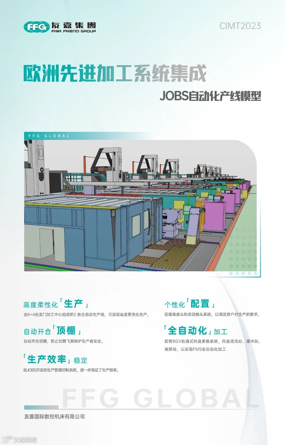 作为机床制造领域的技术领航者,友嘉集团正全力推进核心技术自主可控,为客户提供面向未来的综合性的数字化解决方案。本届CIMT展会期间,友嘉集团旗下品牌JOBS专注于航空航天零部件的工艺研发、加工制造,将展出航空工件自动化生产线模型,观众可亲身体验到友嘉集团在自动化领域的实力。