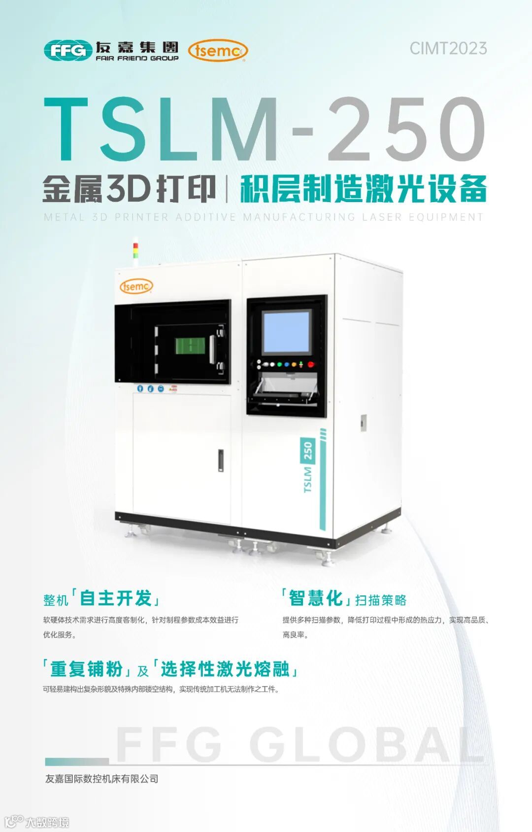 友晁的金属3D打印设备TSLM-250,软硬件皆为自主开发,针对制程参数成本效益进行优化,使用粉体床式选择性激光熔融技术,通过智慧化扫描策略,降低打印过程中形成的热应力,实现高品质、高效率,并可达到高度客制化、符合特殊功能需求。金属 3D 打印和工业机床互补合作,以加减法的技术,为客户提供完整的金属制造解决方案。