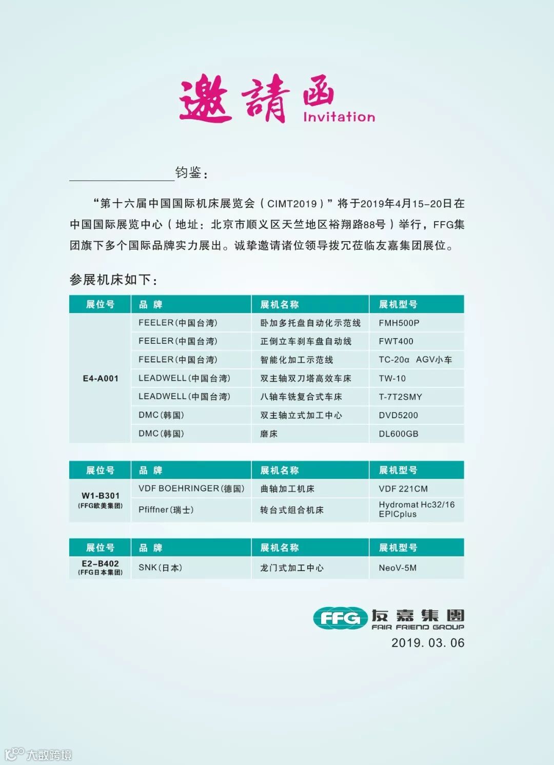经过近几年的不断开拓努力,FFG集团已经一跃成为拥有37大机床品牌,50个生产基地,遍布13个国家和地区的全球性机床集团。友嘉期待4月15日与您相约北京!