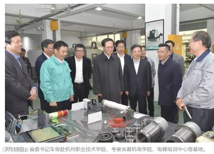 昨日,浙江省省委书记车俊赴杭州职业技术学院友嘉机电学院,考察了机电、电梯等实训情况,对学校开展校企、政校、行校项目合作表示赞赏,希望学校坚持需求导向,进一步深化产教融合、校企合作,为浙江高质量发展培养更多的职业技术人才。