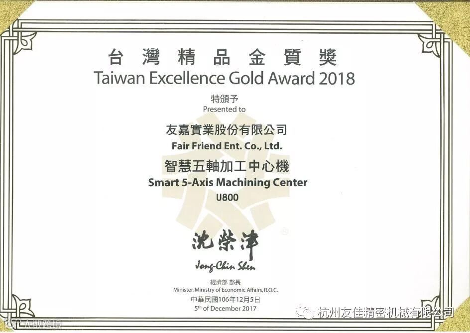 第26届台湾精品共选出10件金质奖及20件银质奖,得奖产品呈现多样化及高附加价值的趋势,产品的范围涵盖医疗器材、资通讯产品、应用软件、智能机械、运动产品等。友嘉智慧五轴机U800从578家厂商,1029件报名产品中脱颖而出,除获得台湾精品奖,更在之后的决赛荣获最高荣誉——第26届台湾精品金质奖。