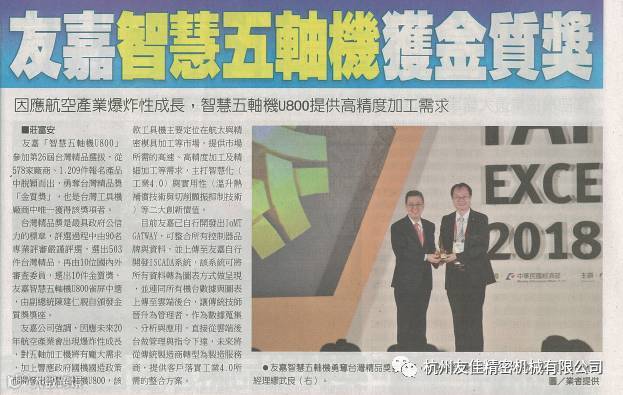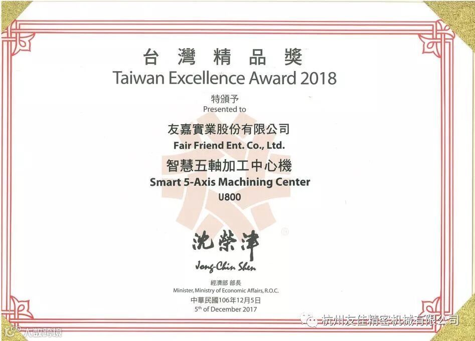 台湾精品奖评选过程中由90名专业评审严禁评选,选出503件台湾精品,再由10位评审员,选出10件金质奖,友嘉智慧五轴机U800雀屏中选。