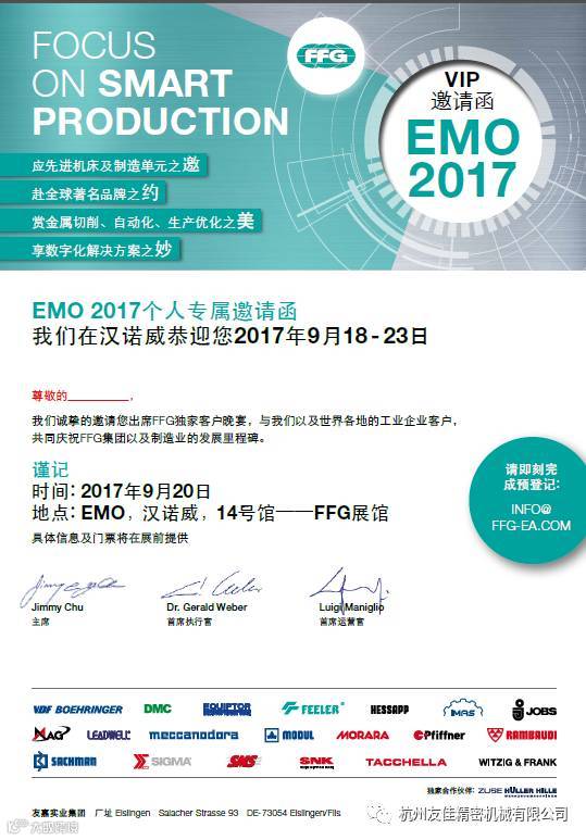 本次EMO展上,友嘉实业集团(以下简称FFG)将在独家展馆14号馆内,展出多条先进的精密智能化生产线以及全球领先的加工设备、制造单元。FFG集团携手旗下众多知名机床品牌联袂展出,聚焦于智能生产解决方案。