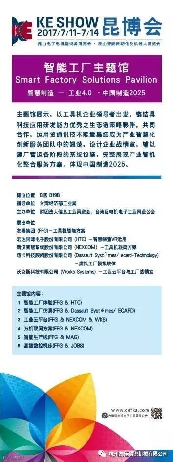 友嘉国际数控机床有限公司2017年昆山电子电机博览会于2017年7月11日至14日在昆山花桥国际博览中心举行,展会地址:昆山市花桥镇绿地大道1588号。我司摊位:B42。参展机型如下:立式加工中心VMP-32A,友佳万客隆MFV-36T,TC-20α另有智能工厂主题馆展示。