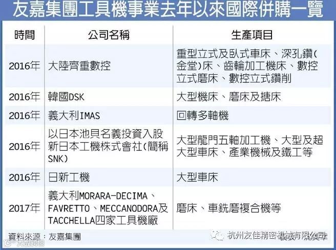 友嘉集团总裁朱志洋日前宣布,刚并购意大利Morara-Decima等4家工具机厂,年营业额增加1亿美元,今年挑战2亿美元,友嘉集团一举跃升为全球最大立式加工中心、磨床及汽车业用工具机集团,预计3年内磨床营收可达3亿多美元,新台币破百亿元,今年还会持续并购。