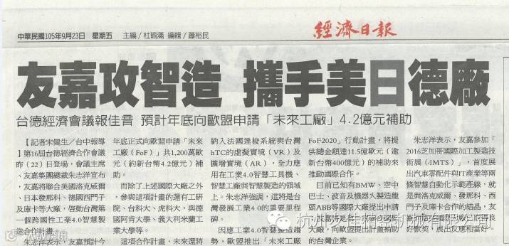 朱志洋表示,友嘉参加「2016芝加哥国际加工制造技术展(IMTS)」,首度展出汽车零配件与IT产业等两条智慧自动化示范产线,就是与洛克威尔、发那科、西门子及库卡合作的结晶,友嘉与这些国际大厂已取得良好默契,展出反应相当好。