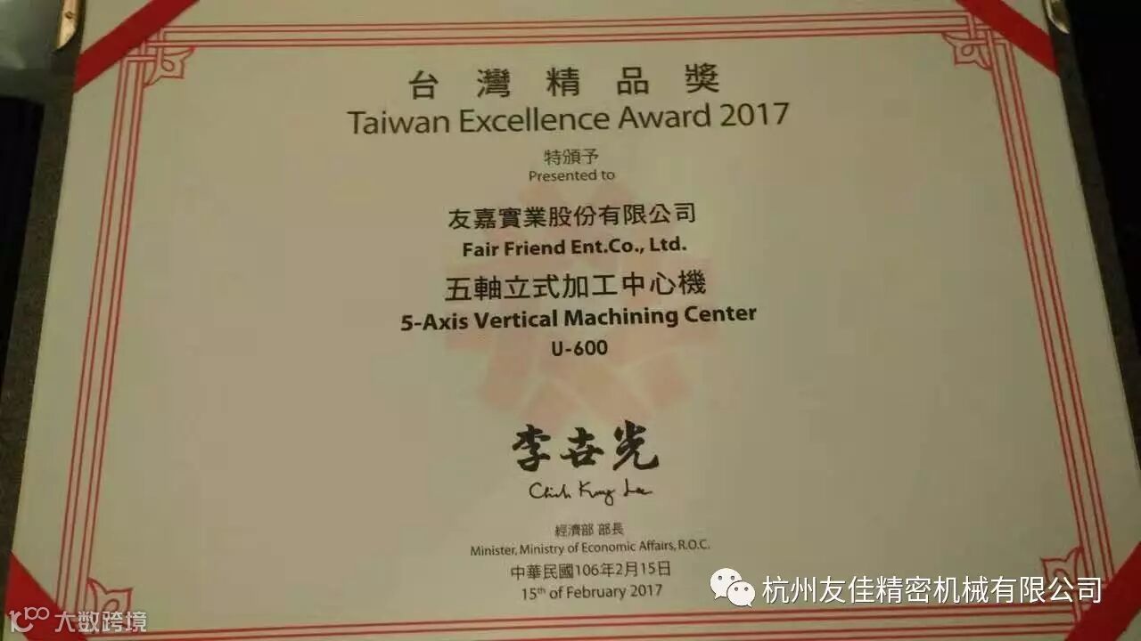 友嘉国际数控机床有限公司昨天,台湾传来消息,我司五轴立式加工中心机U-600 荣获台湾精品奖殊荣。 台湾精品奖(Taiwan Excellence Awards)是经济部国际贸易局(下简称"国贸局")与台湾对外贸易发展协会(下简称"贸协"),自1993年起,为了推展台湾优质产品,所进行的产品评选竞赛,除了依照各产品的类别,选拔出台湾精品,更设置专业的金、银奖,藉以加强台湾的形象。