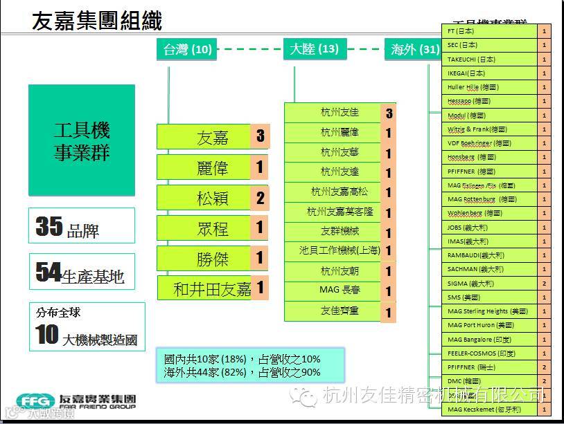 友嘉国际数控机床有限公司友嘉集团经过30余年不断的努力,到如今发展成为全球唯一一家横跨近10个国家和地区,35个品牌,54家营运基地的跨国集团,产品涵盖了航空航天、风力发电、汽车、通信、电子等多个领域,从中端到高端,再到世界顶端,产品一应俱全。