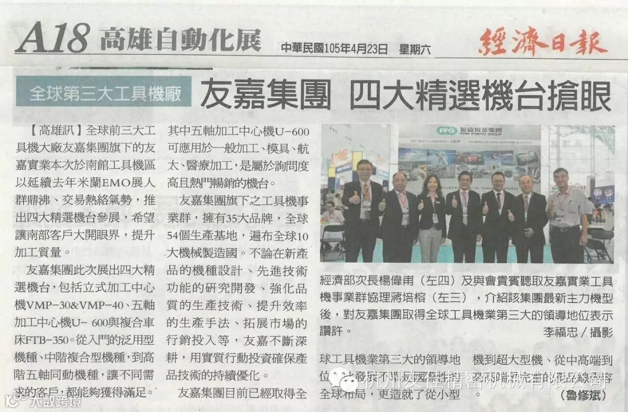友嘉集团目前已经取得全球工具机业第三大的领导地位,此发展不单是国际性的全球布局,更造就了从小型机到超大型机,从中高端到高高端最完整的产品线内容。