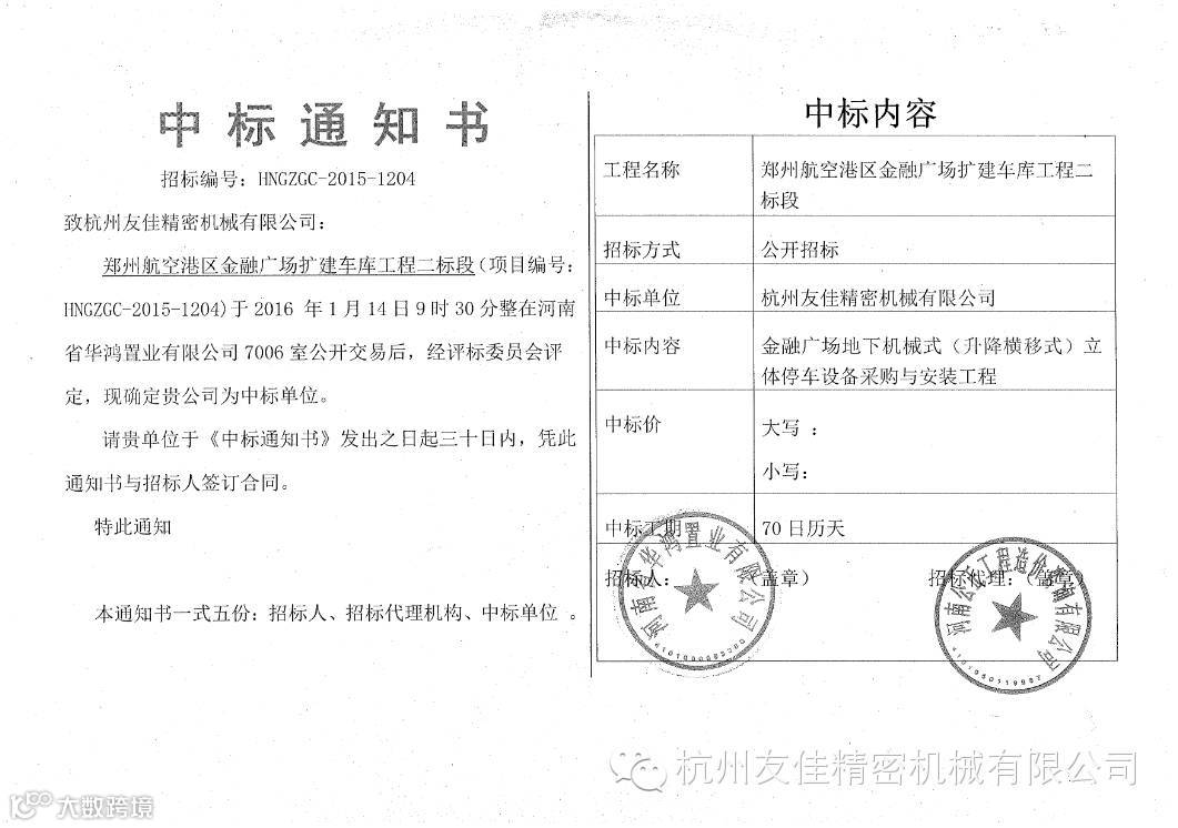 感谢社会各界的支持,恭喜杭州友佳精密机械有限公司郑州办喜中郑州航空港区金融广场扩建车库工程二标段,我们会用最优质的服务回馈相信我们的客户~
