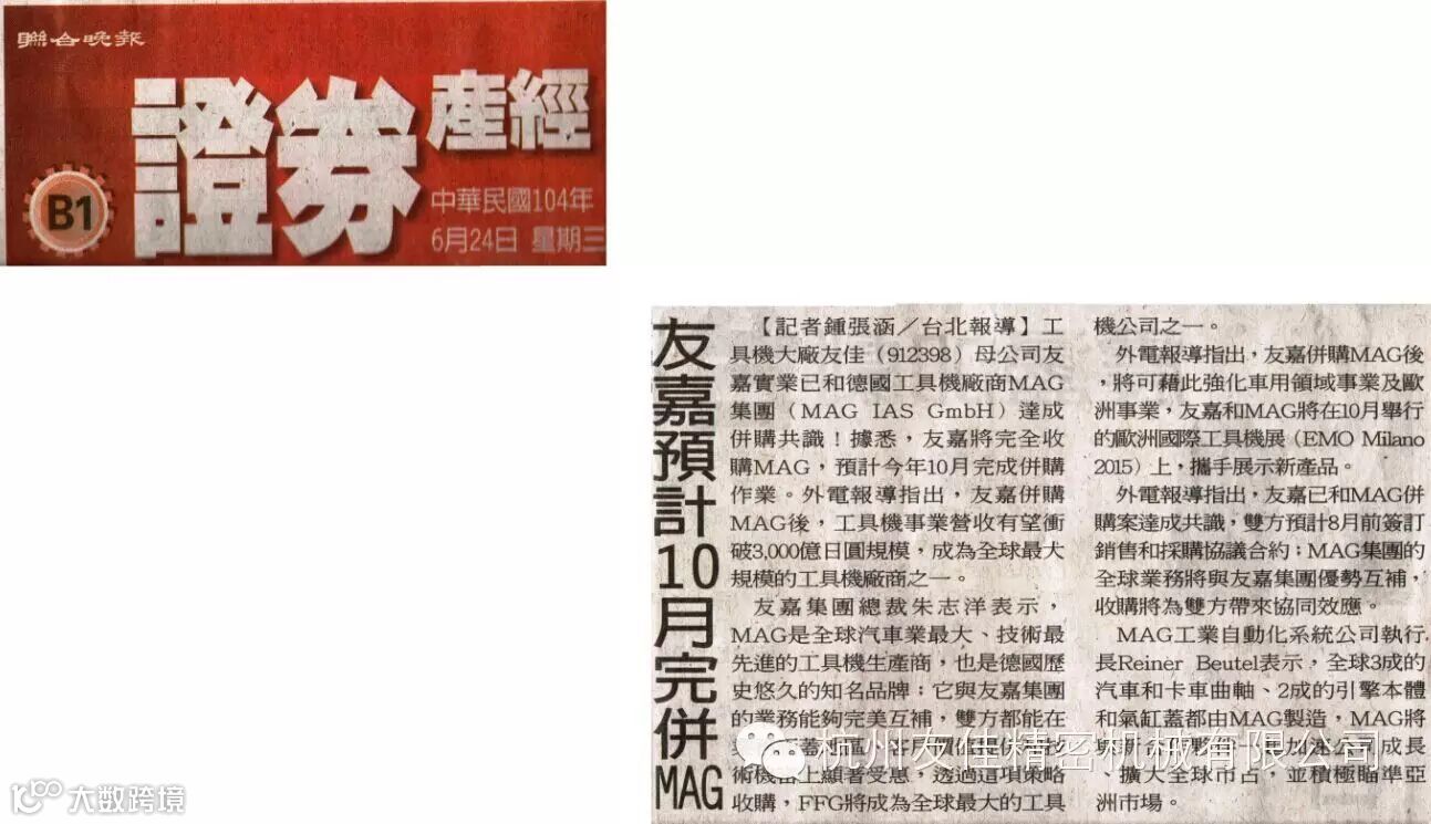 工具机大厂友佳母公司友嘉集团已和德国工具机厂商MAG集团(MAG IAS Gmbh)达成并购共识!据悉,友嘉将完全收购MAG,预计今年10月完成并购作业。外电报道指出,友嘉并购MAG后,工具机事业营收有望冲破3000亿日圆规模,成为全球最大规模的工具机厂商之一。