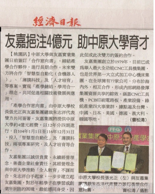 中原大学与友嘉实业集团日前签订合作意向书,缔结产学合作伙伴,进行长期合作。未来双方将合作‘智慧型自动化(含机器人)’、‘薄膜科技’及‘人才培育’等专案,实现‘产学链结,学用合一’理念,共同促进相关技术发展与应用。