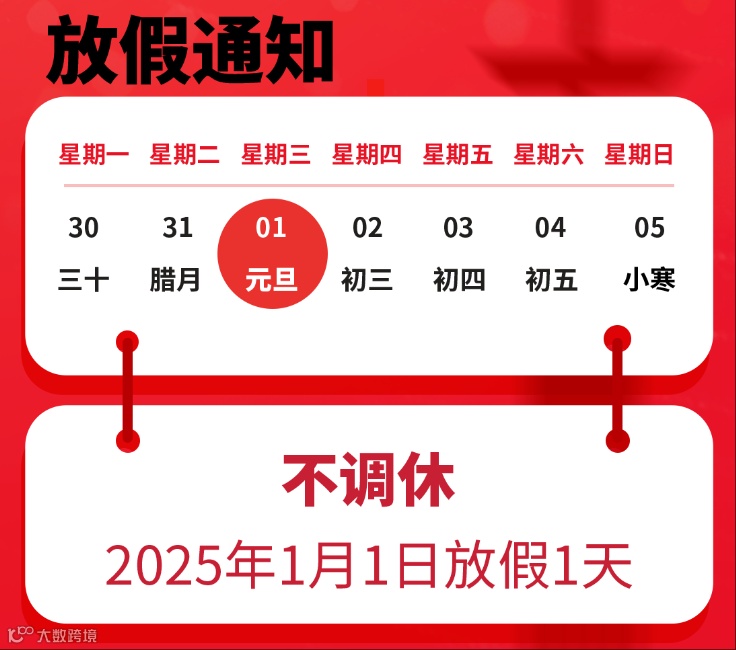 为了让大家能够充分感受节日的喜悦,与家人共度美好时光,公司决定于2025年1月1日元旦当天放假一天。