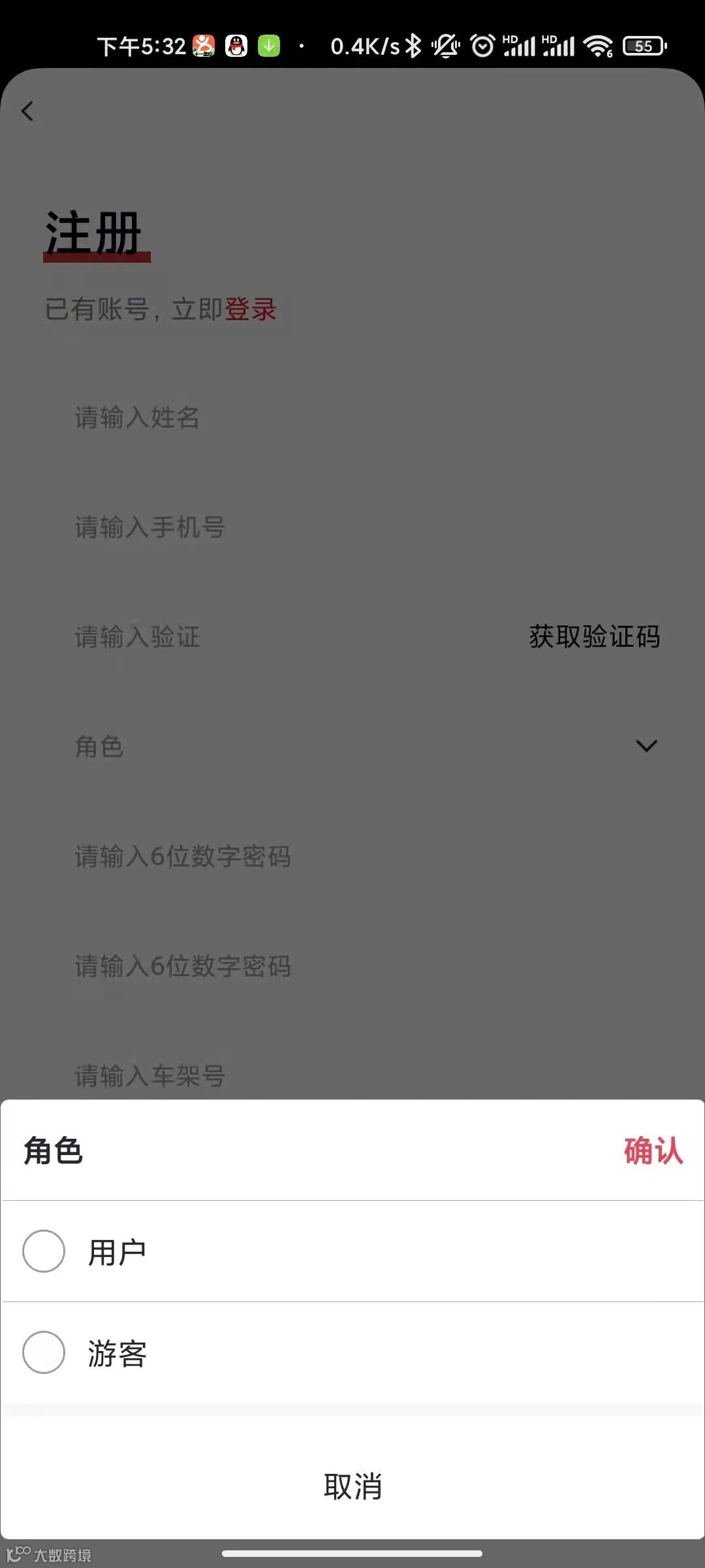 初次安装APP后,第一步需要注册账号,注册账号时,除了基本信息之外,需要选择角色,如果您是咱们英虎的用户,就选择『用户』,并填写车架号。不管您在哪儿跨区作业,都能在APP里面查询附近服务站信息。