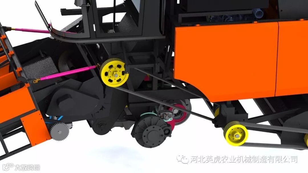 3、部分主传动由链条传动改为皮带传动,扭力传递更平顺,降低了车身振动和噪音。向国外农机产品学习,采用大直径皮带轮,传递扭矩更大而且拆装简便易维修。