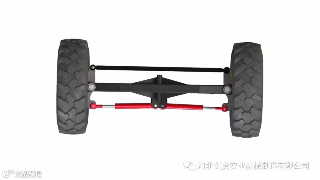 4、转向桥升级为双转向油缸助力,高速行驶或收割时车身明显比单转向油缸结构的收获机稳定,打方向也更轻便,同时增大轮胎扭转角度,转弯半径比18款减小1米。