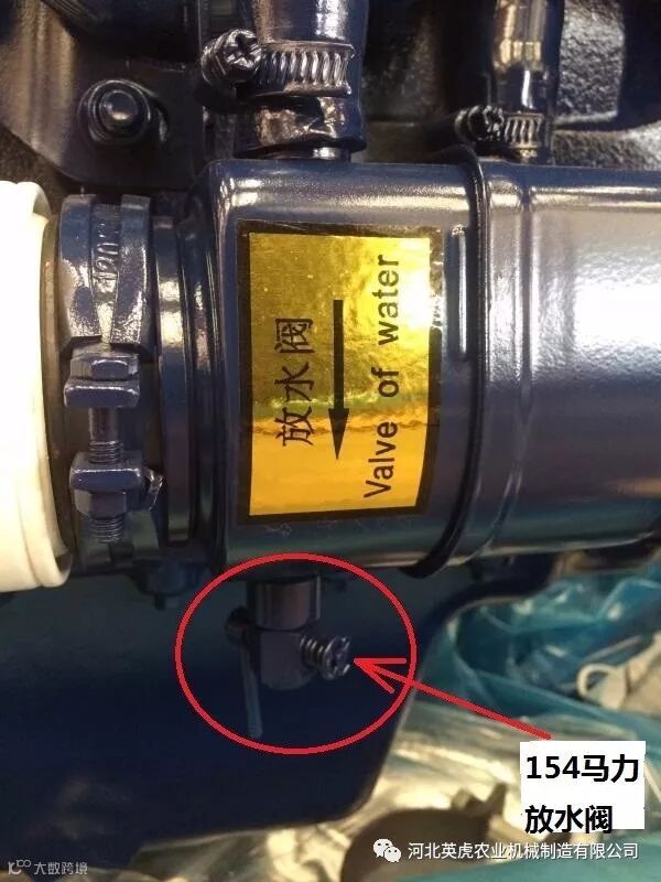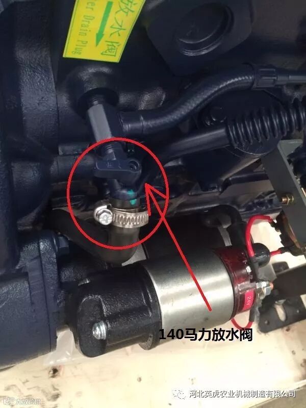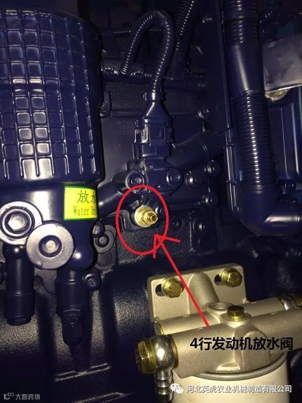 秋收结束后,玉米收获机在入库前发动机和空压机一定要放水,以避免冬天气温低,冻坏发动机和空压机。各发动机的具体放水位置如下图所示: