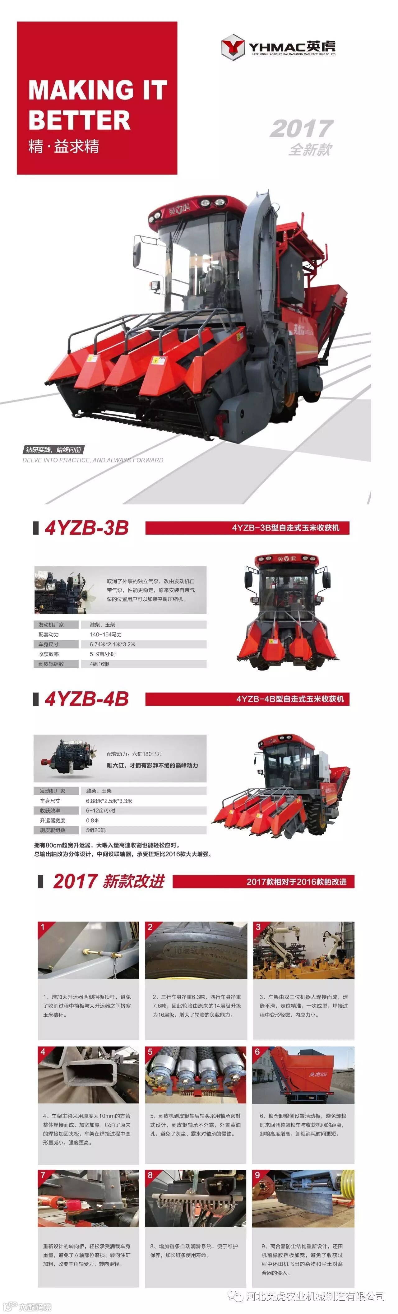 2017款玉米收获机在延续了2016款英虎品牌拥有6缸180马力发动机、成熟的不对行割台0.8米超宽大升运器、气动助力离合、制动系统以及电动籽粒卸粮等优势的基础上,重点在可靠性上做了大量的改进。对剥皮机、转向桥、粮仓等重要部位进行了全新的设计。
