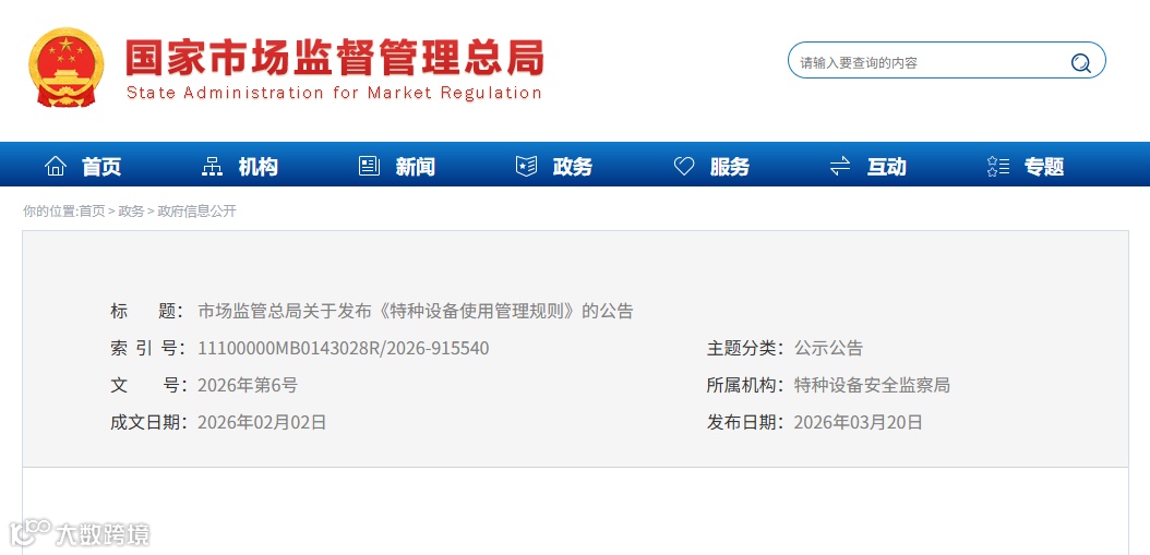 为贯彻落实《特种设备使用单位落实使用安全主体责任监督管理规定》(国家市场监督管理总局令第74号),进一步加强特种设备使用单位监管,市场监管总局对《特种设备使用管理规则》(TSG08-2017)进行了修订,现予以发布,自2026年5月1日起施行。