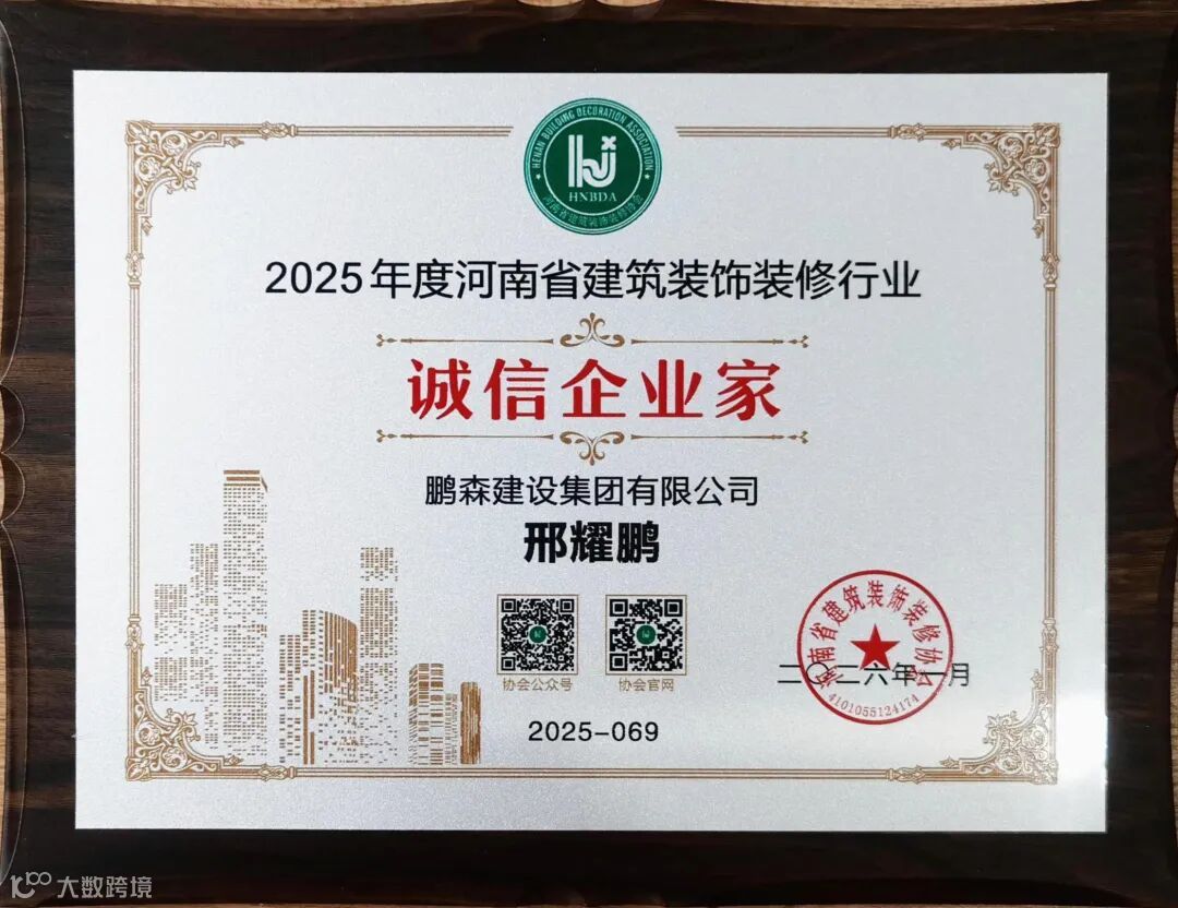 大会对2025年度为河南省建筑装饰装修行业发展作出突出贡献的先进企业与个人进行了表彰。凭借在工程质量管控、诚信经营实践、行业责任担当等方面的卓越表现,鹏森建设集团董事长邢耀鹏荣获“2025年度河南省建筑装饰装修行业诚信企业家”荣誉称号,集团被授予“2025年度河南省建筑装饰装修行业质量诚信(质量先进)企业”荣誉称号。